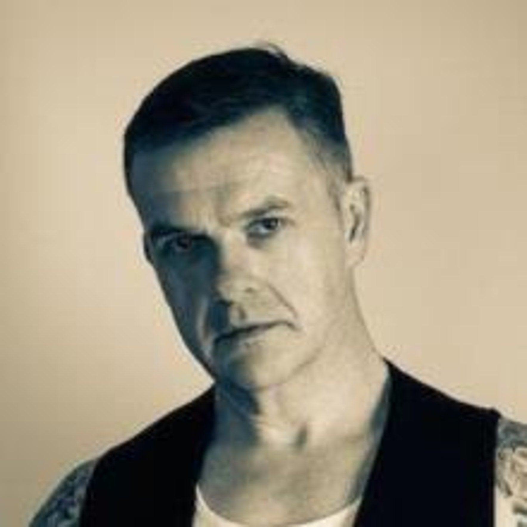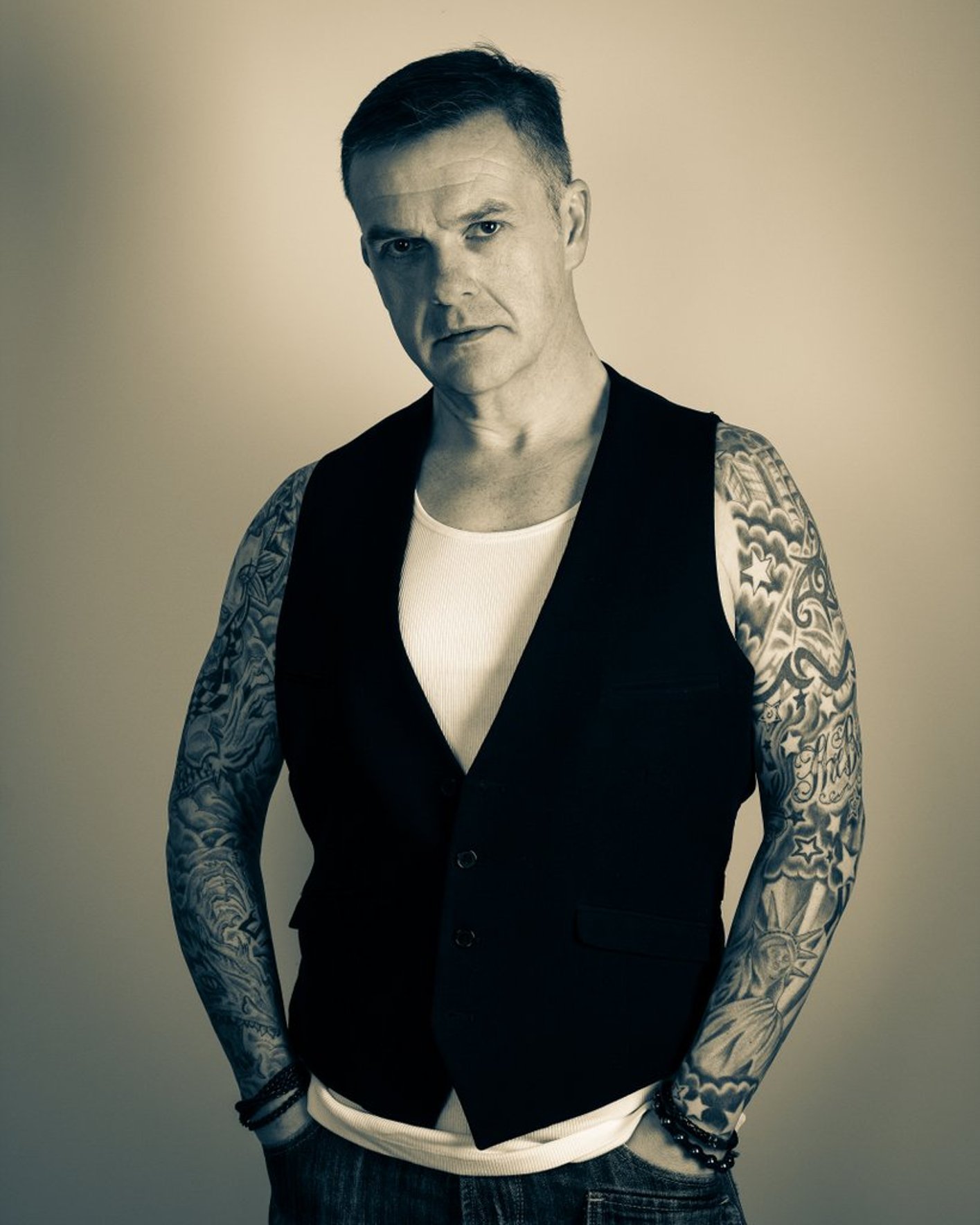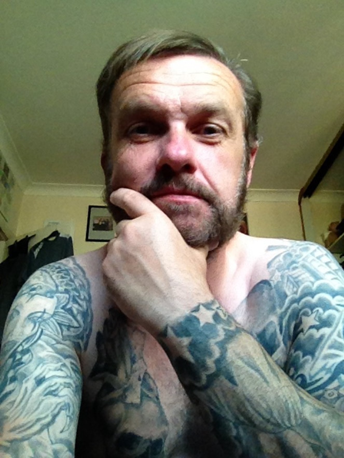 Tattoos: Both arms - full sleeves; Back Black & Grey Tribal; Chest: 2 x Skulls